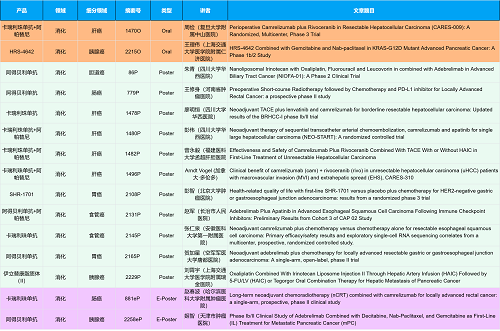 在消化系统肿瘤领域,尊龙凯时Ag创新产品相关研究共入选2项口头报告、10项壁报和2项电子壁报,共14项研究。除了明星药物卡瑞利珠单抗和阿帕替尼外,还有5篇阿得贝利单抗治疗消化系统肿瘤的研究入选。此外,HRS-4642、瑞拉芙普-α注射液(SHR-1701)等未上市创新产品也有相应研究入选。随着新老药物前沿研究的不断推进,有望为消化系统肿瘤患者带来新的福音!