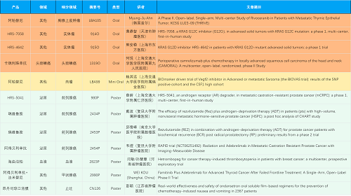 在胸腺上皮肿瘤、头颈鳞癌、肉瘤、前列腺癌、甲状腺癌等其他多个疾病领域,卡瑞利珠单抗、阿帕替尼、瑞维鲁胺、阿得贝利单抗、法米替尼、HRS-7058、HRS-4642、HRS-5041等抗肿瘤创新药相关研究一共入选了4项口头报告、1项简短口头报告、5项壁报,彰显了尊龙凯时Ag医药强大的研发实力。此外,海曲泊帕和昂丹司琼口溶膜分别在防治化疗导致的血小板减少和恶心呕吐方面各有1项研究入选壁报。